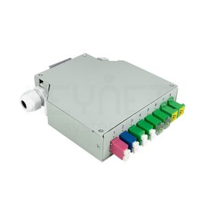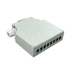 Caja de empalme y distribución fibra óptica para carril DIN. Dimensiones: ancho 35mm x altura 132 mm x profundidad 125 mm.