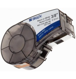 Cartucho Recambio etiquetas adhesivas para bloques terminales o paneles de conexiones. Longitud 4.9 m. Ancho 9,53 mm. Material Nylon (Polyamide). Color de la cinta: Negro sobre Blanco. Para usar con impresoras BRADY BMP21-PLUS, BMP21, ID PAL. Ref. fabricante : M21-375-499-TB