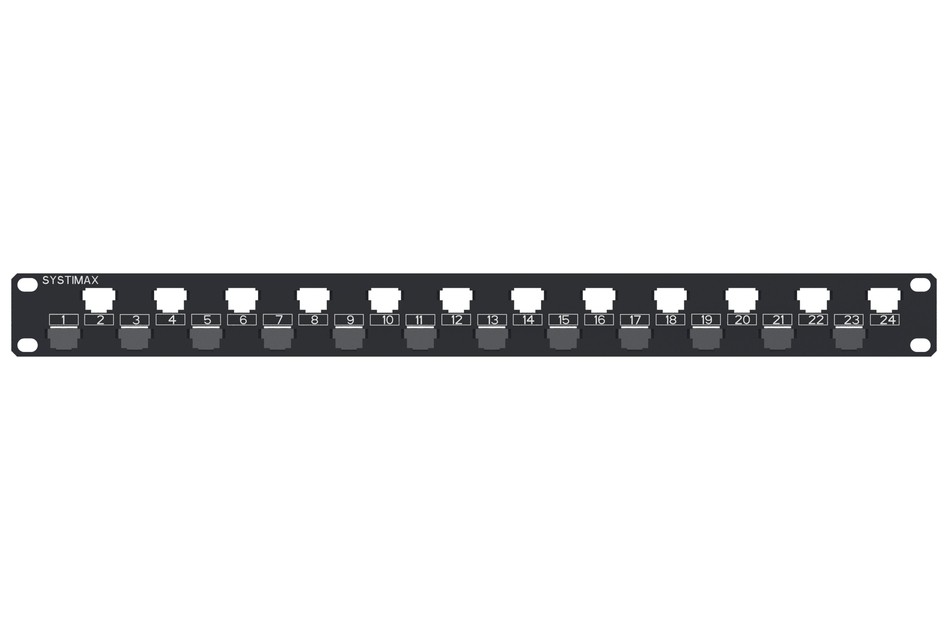 Panel de parcheo FlexiMAX U/UTP Panel de parcheo de alta densidad, Categoría 6 UTP, 24 puertos RJ45, 1 Unidad de altura, No apantallado. No incluye tomas RJ45.