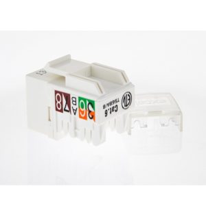 Toma RJ45 sin apantallar de Categoría 6 en formato Keystone corto para transmisión de datos de hasta 1Gigabit Ethernet en color blanco. Terminación mediante herramienta inserción tipo 110. Ref. fabricante : 100-011